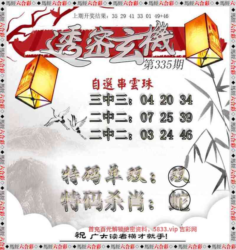 335期平特:【猪】 335期二连:【猪龙】【蛇马】 335期三连:【猪龙鼠】【蛇马兔】 |